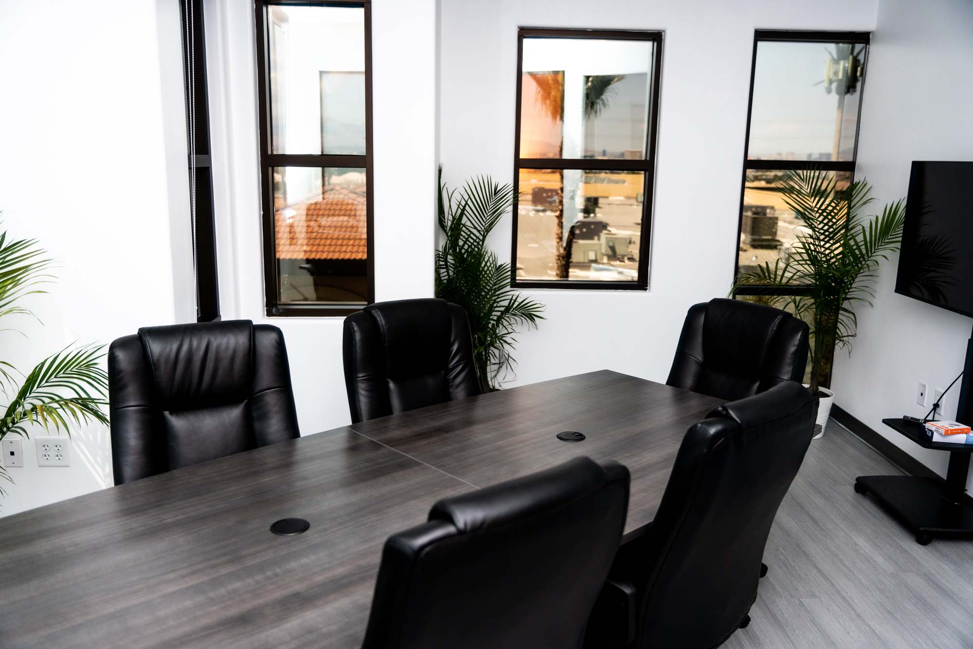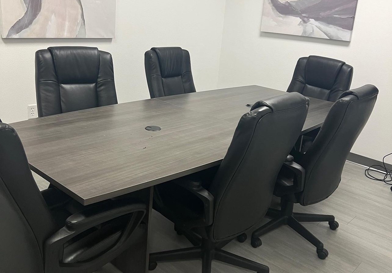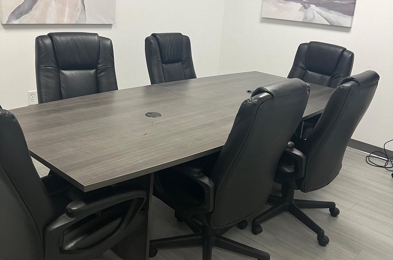 Equipped with an 8ft conference table that seats 6 comfortably, executive chairs, 50 in. moveable TV monitor, and decor.